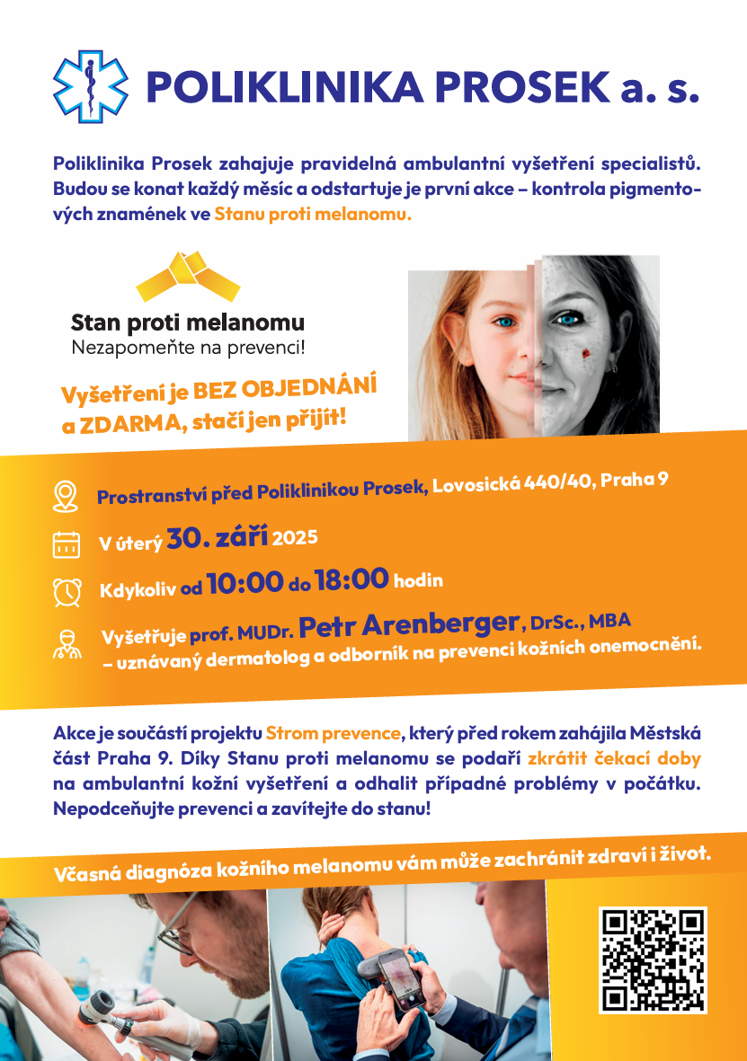 Poliklinika Prosek a.s. proto ve spolupráci s Městskou částí Praha 9 umístí v úterý 30. září 2025 na prostranství před poliklinikou Stan proti melanomu, kde bude od 10 do 18 hodin vyšetřovat dermatoskopem uznávaný dermatolog a odborník na prevenci kožních onemocnění profesor MUDr. Petr Arenberger, DrSc., MBA.