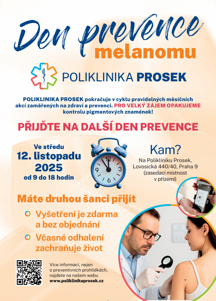 V dnešním hektickém tempu si mnozí z nás těžko hledají čas na své zdraví. Jenže právě včasná prevence může rozhodnout o tom nejdůležitějším – o zdraví a kvalitě života. Proto jsme spustili na Poliklinice Prosek pravidelný seriál preventivních a edukačních akcí. Každý měsíc se tady můžete setkat s odborníky z různých oborů a nechat se vyšetřit, nebo získat doporučení, radu pro další prevenci nebo postup léčby. To vše zdarma, rychle, bez objednání a bezbolestně.